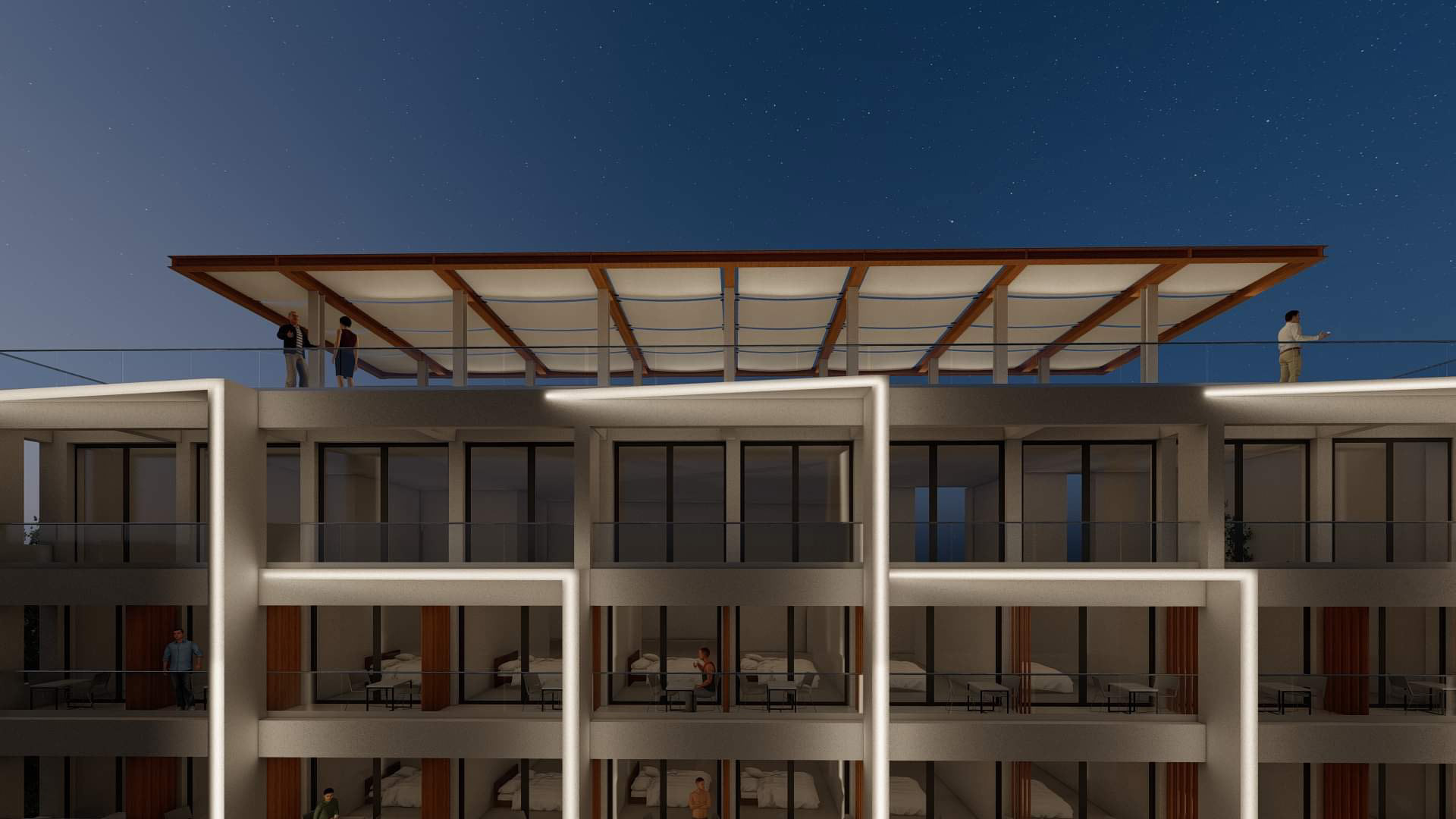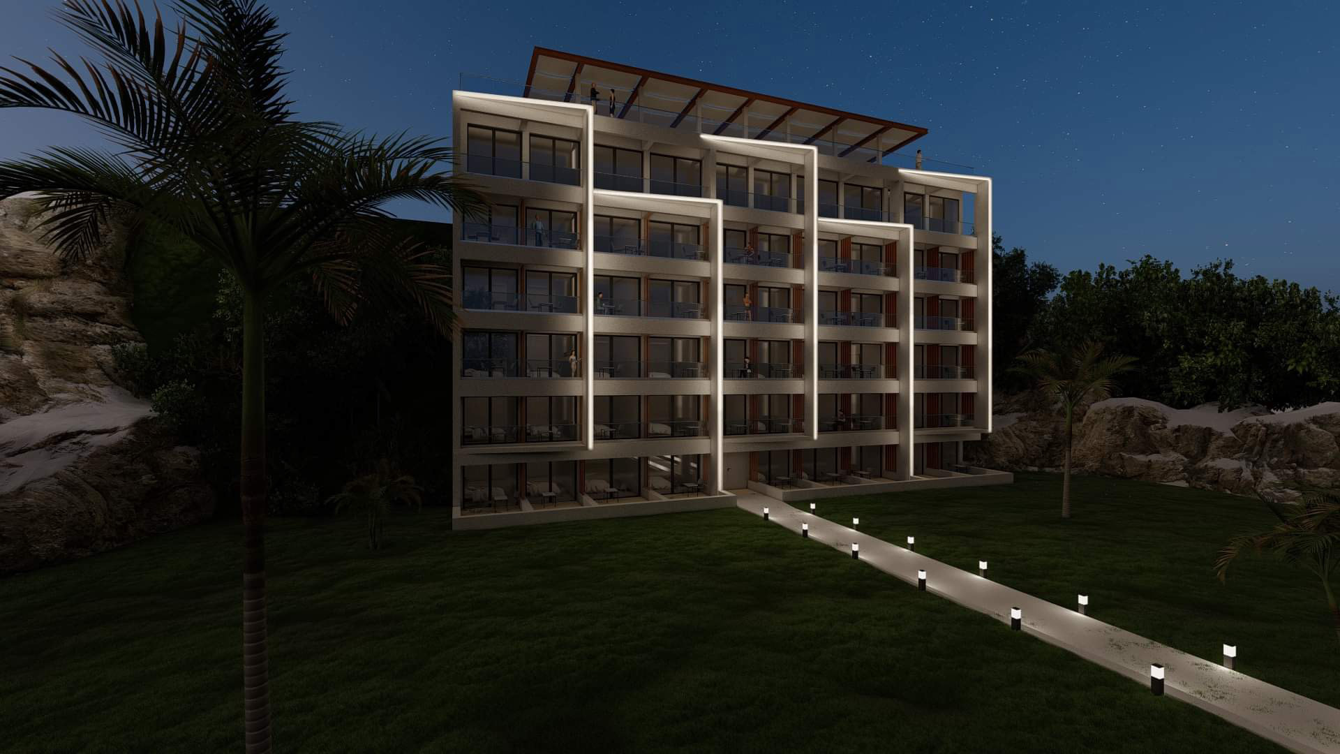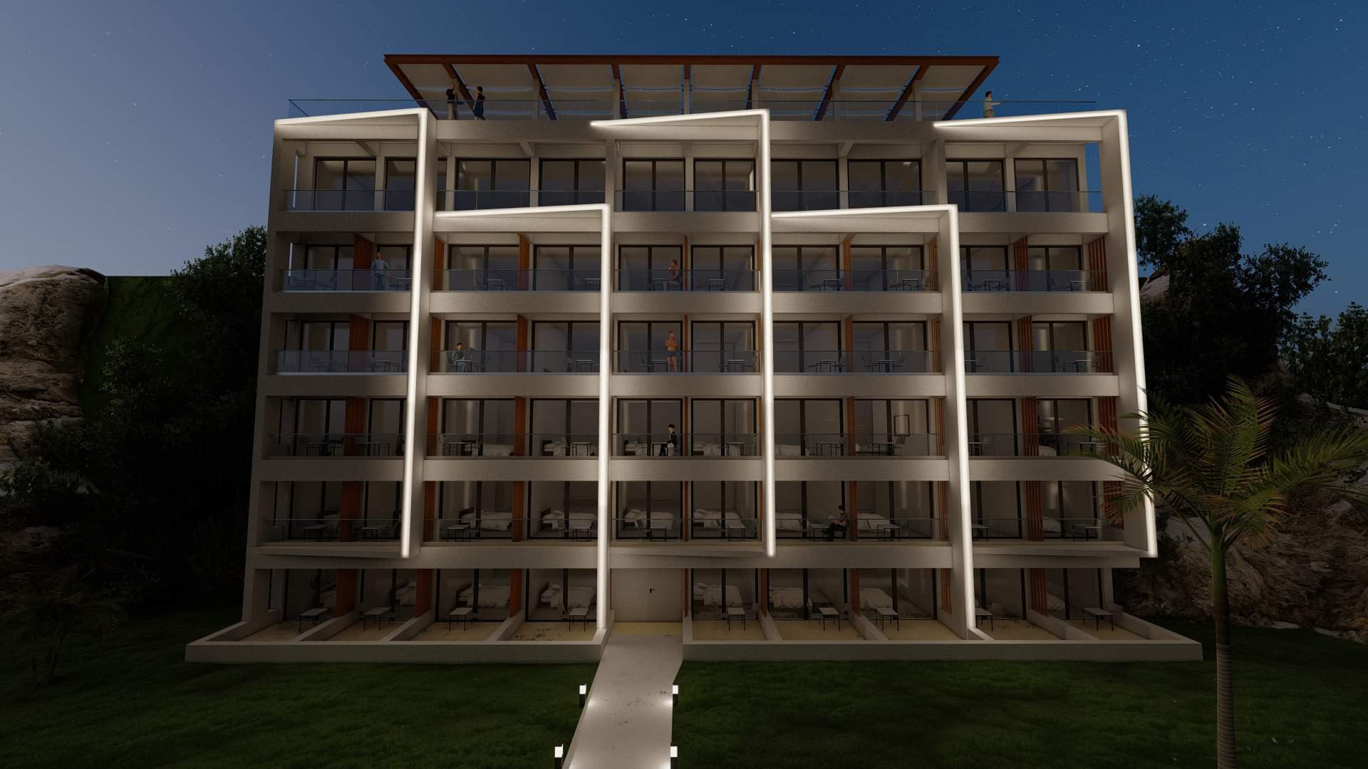This project is about the renovation of the facades of one of the most known hotels in Corfu island, as well as the design of a roof garden. Its location, which is right next to the airport, makes it the first hotel that every visitor sees by the time they land on the island. It provides a great opportunity to design something that stands out from its surroundings but it blends in at the same time. The design of simple geometries highlighted by the night lights provides a modern yet discreet look that blends in with the nature and provides the guests the calmness they seek.
