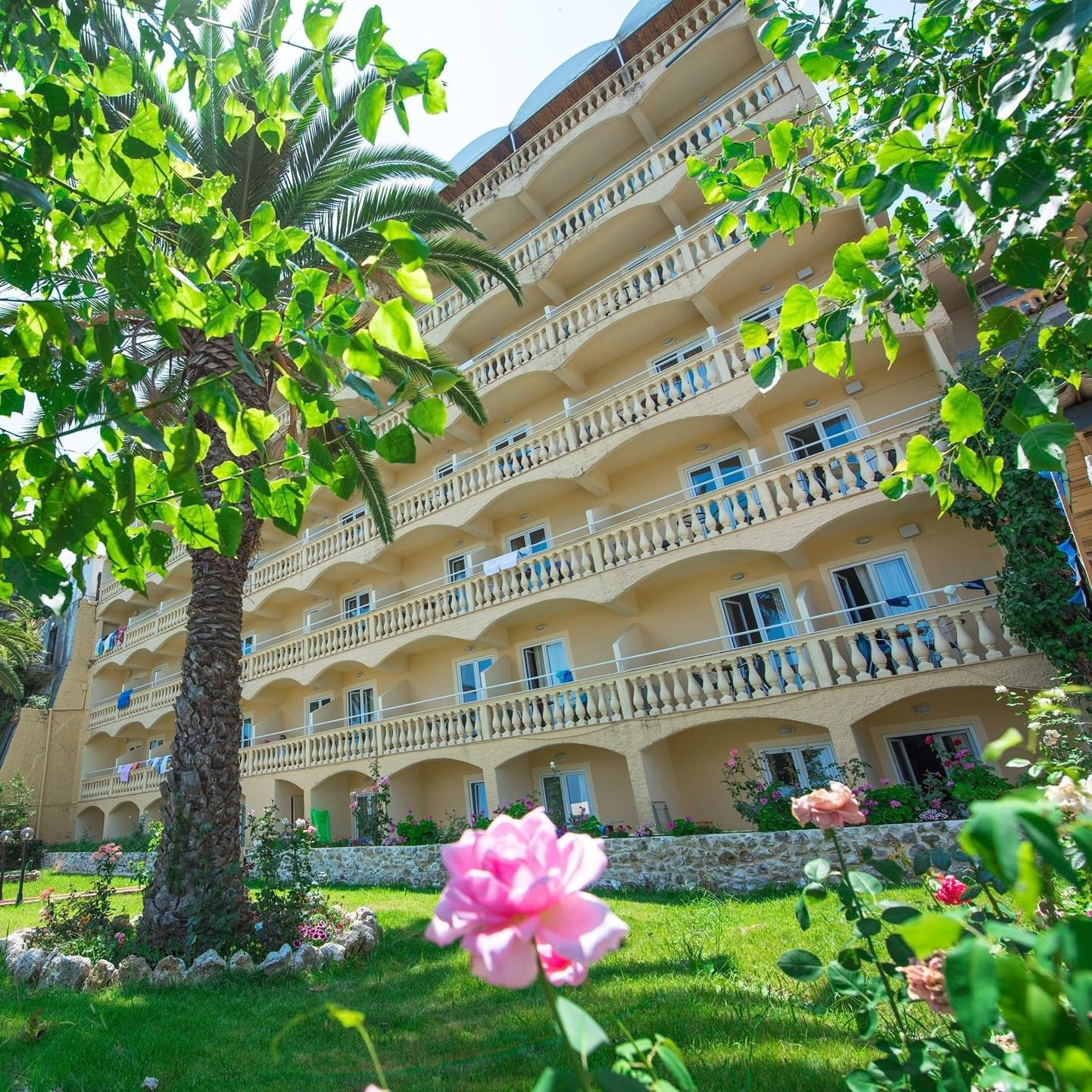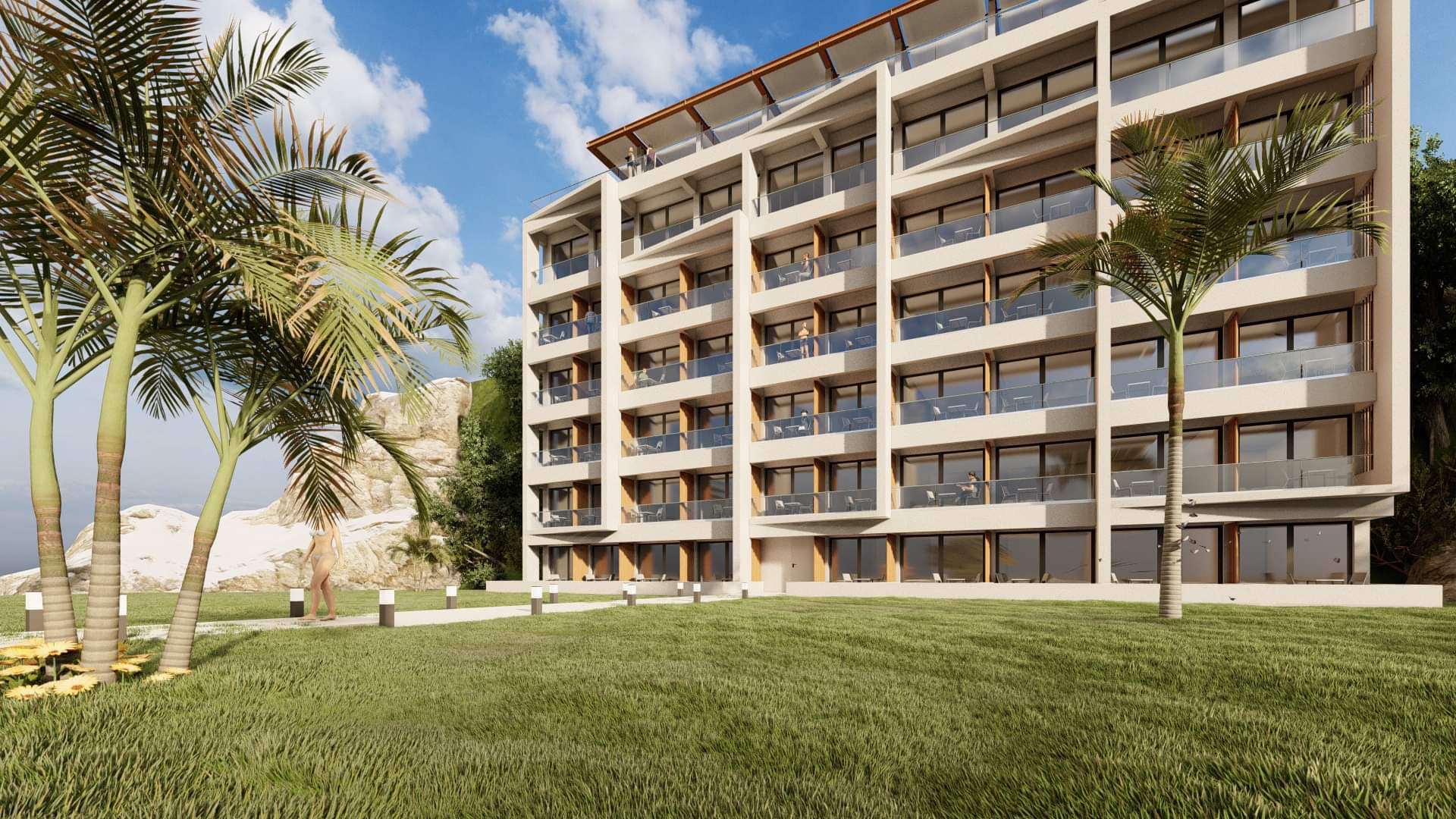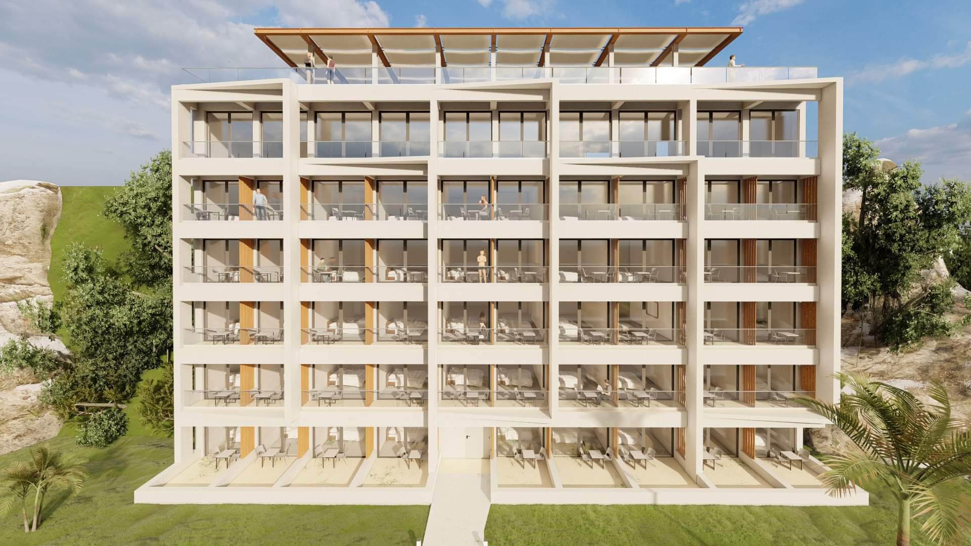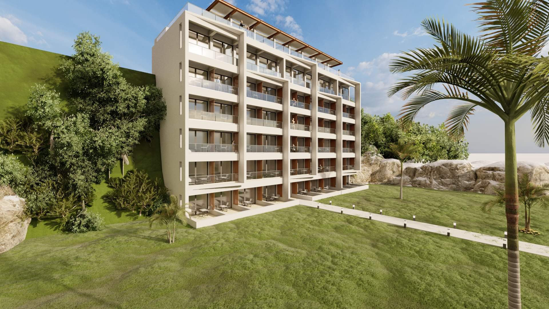 This project is about the renovation of the facades of one of the most known hotels in Corfu island, as well as the design of a roof garden. Its location, which is right next to the airport, makes it the first hotel that every visitor sees by the time they land on the island. It provides a great opportunity to design something that stands out from its surroundings but it blends in at the same time. The design of simple geometries highlighted by the night lights provides a modern yet discreet look that blends in with the nature and provides the guests the calmness they seek.